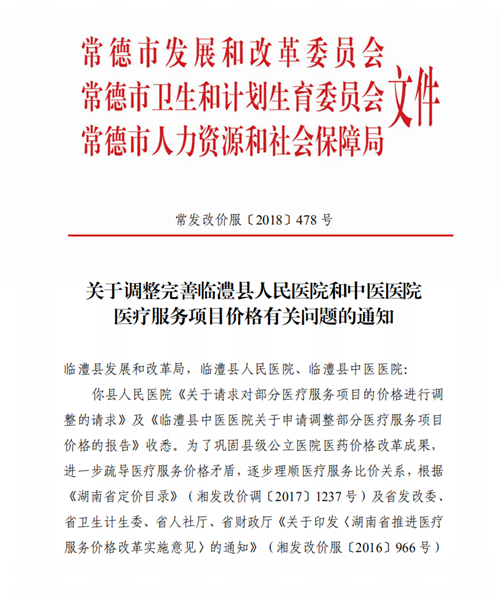 经调查,临澧县人民医院2017年开展的医疗服务项目1162项,依据成本核算结论常德市发改委于2018年11月调整了该医院的医疗服务项目收费标准,其中647项调升、317项调降。